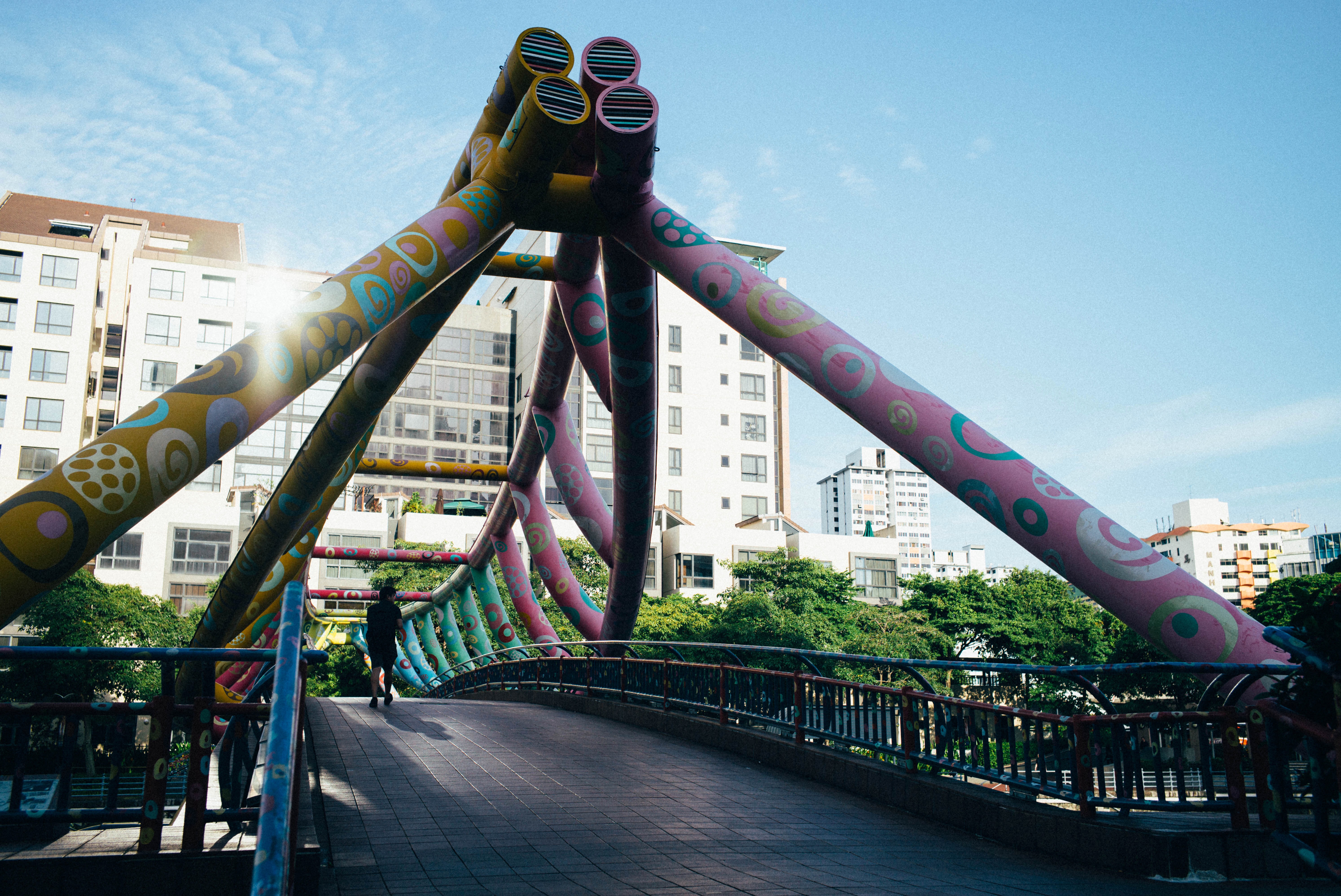 This vibrant photograph captures a uniquely designed bridge with exuberant pink and yellow patterns, stretching gracefully over a lush urban landscape. The bright blue sky and soft sunlight enhance the cheerful mood, while a solitary figure traverses the structure, adding a sense of scale and tranquility to the lively setting.