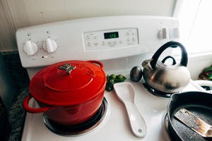 The photograph captures a vibrant red Dutch oven atop a pristine stovetop, evoking a sense of warmth and home-cooked comfort. Soft, natural light streams in from a nearby window, highlighting the glossy surfaces and inviting a peaceful cooking ambiance. The arrangement of kitchen utensils and the kettle adds a functional yet artistic element, celebrating the everyday rituals of cooking.