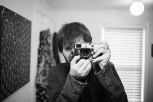 In this black and white photograph, a man captures his own image through the lens of a classic camera. The soft lighting from the nearby window creates a moody, introspective atmosphere, while the reflection highlights his engagement in the art of photography. The textured wall and the clothes hanging in the background add depth to the scene, emphasizing a personal space filled with creativity.