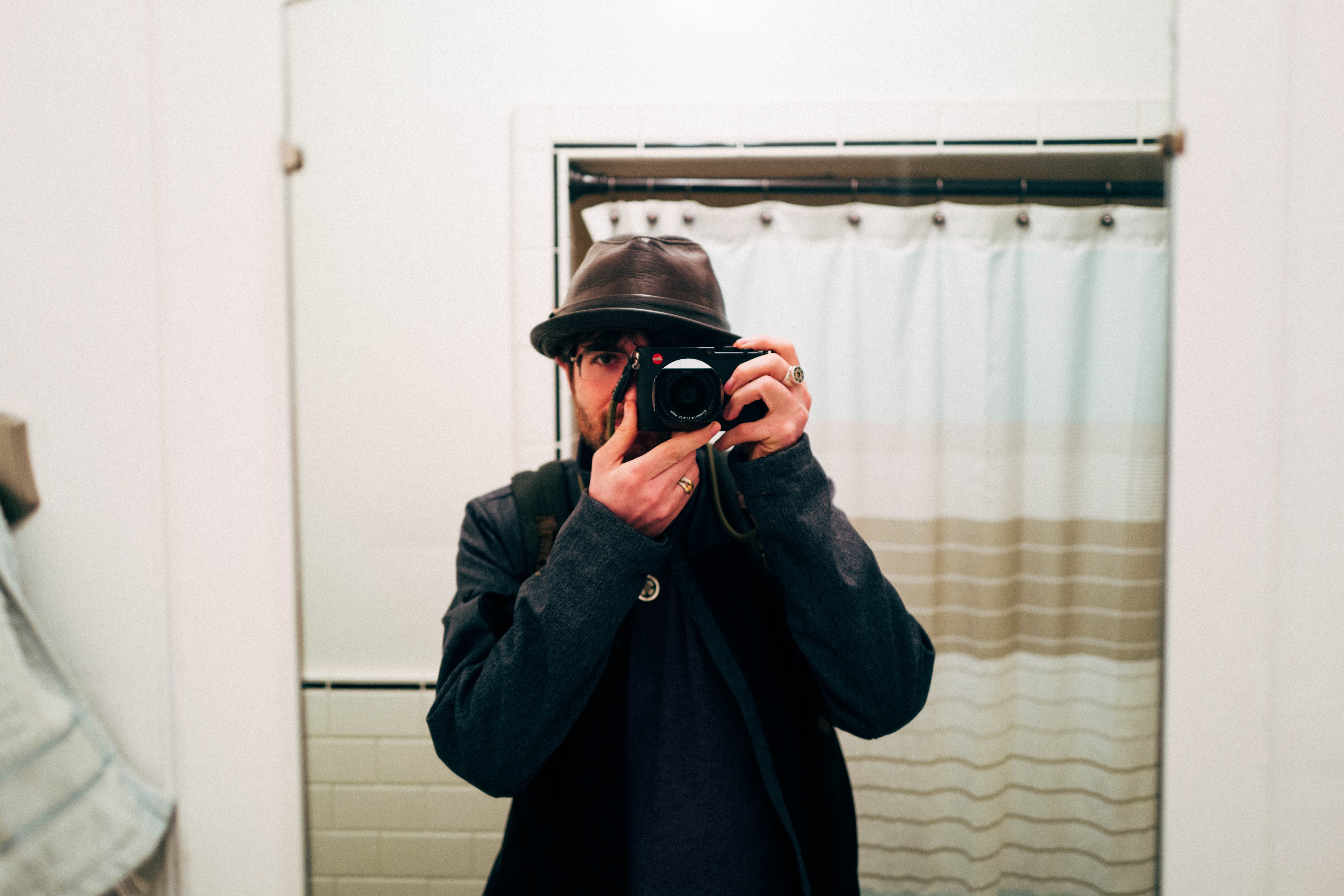 In a softly lit bathroom, the subject captures a moment of introspection with their camera, gazing into the mirror. The neutral tones and subtle reflections create an intimate atmosphere, while the subject's stylish attire adds a touch of character. This composition invites viewers to ponder the nature of self-portraiture and the stories that lie within everyday spaces.