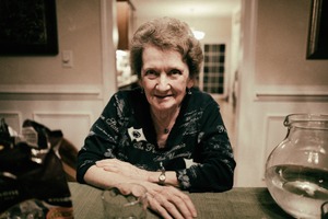 The photograph captures an elderly woman sitting at a table, exuding warmth and friendliness with a gentle smile. Soft, ambient lighting creates an intimate atmosphere, highlighting her features and the inviting surroundings of the home, while her relaxed posture suggests comfort and familiarity. The composition draws the viewer's attention directly to her, enveloping the scene in a sense of nostalgia and connection.