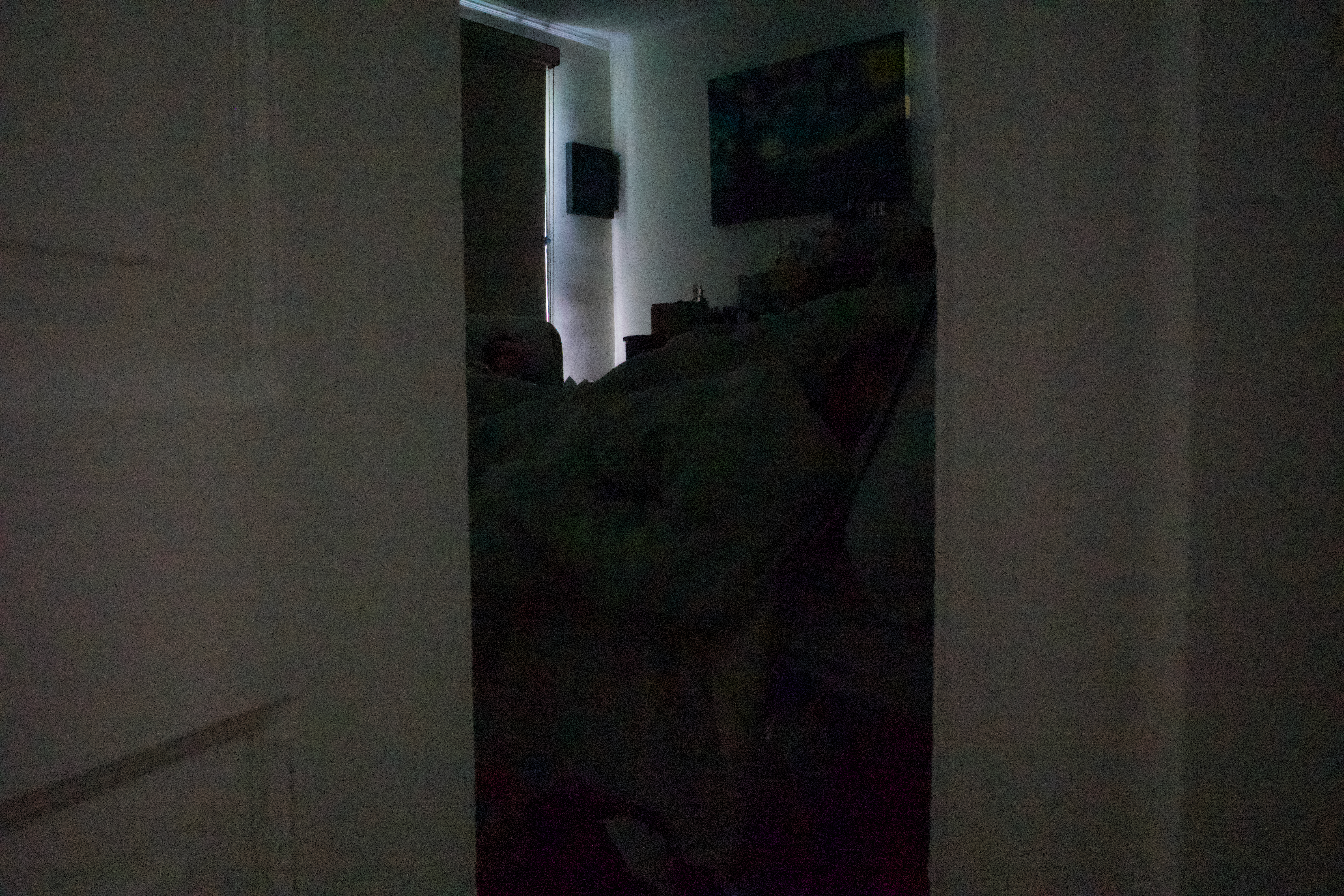The photograph captures a dimly lit bedroom, viewed through a slightly ajar door, enhancing the sense of intimacy and seclusion. Soft, muted light spills from a window, subtly illuminating the forms on the bed, while deep shadows envelop the rest of the scene. The mood is tranquil and introspective, evoking a serene moment of respite.