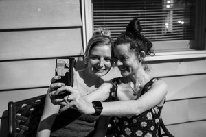 Two friends share a candid moment, capturing a selfie with bright smiles and playful expressions. The contrast of the black and white composition emphasizes their joyful connection, while the sunlight streaming through the nearby window creates a warm yet understated ambiance. Their relaxed postures and genuine laughter inject a sense of carefree friendship into the scene.