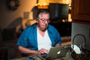 In a cozy kitchen setting, an older man sits focused on his laptop, illuminated by soft, warm lighting that creates an intimate atmosphere. The blurred background adds depth, emphasizing his concentration amidst a tranquil home environment. His casual attire conveys a sense of comfort and relaxation, inviting viewers into a moment of personal reflection or productivity.