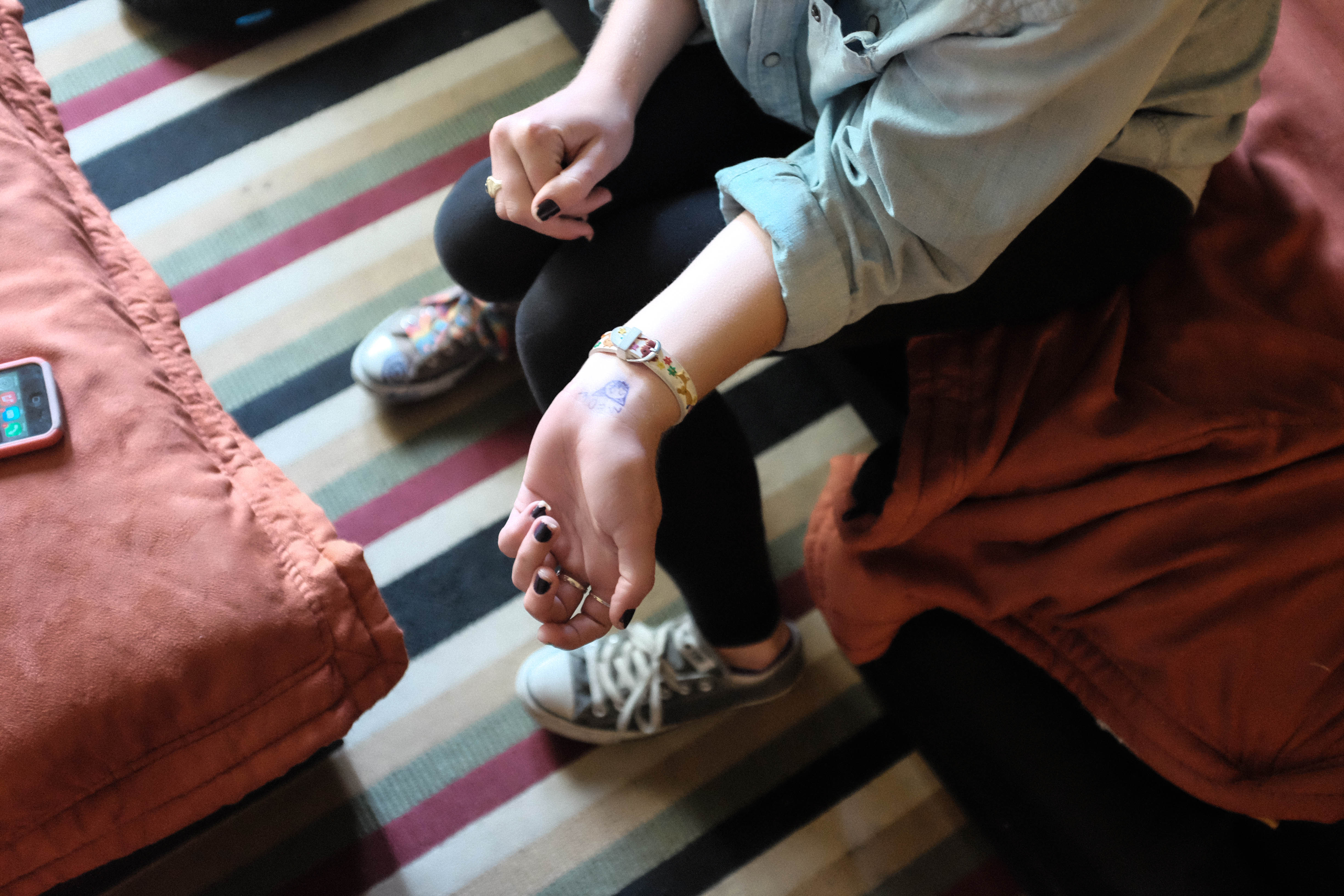 A young woman's arm is prominently featured, adorned with a colorful bracelet and a playful, inked illustration on her wrist. The warm, inviting ambiance of a cozy living room setting is highlighted by the striped rug and casually scattered cushions, evoking a sense of laid-back intimacy. Soft, natural lighting enhances the cheerful colors, suggesting a moment of relaxation and self-expression.