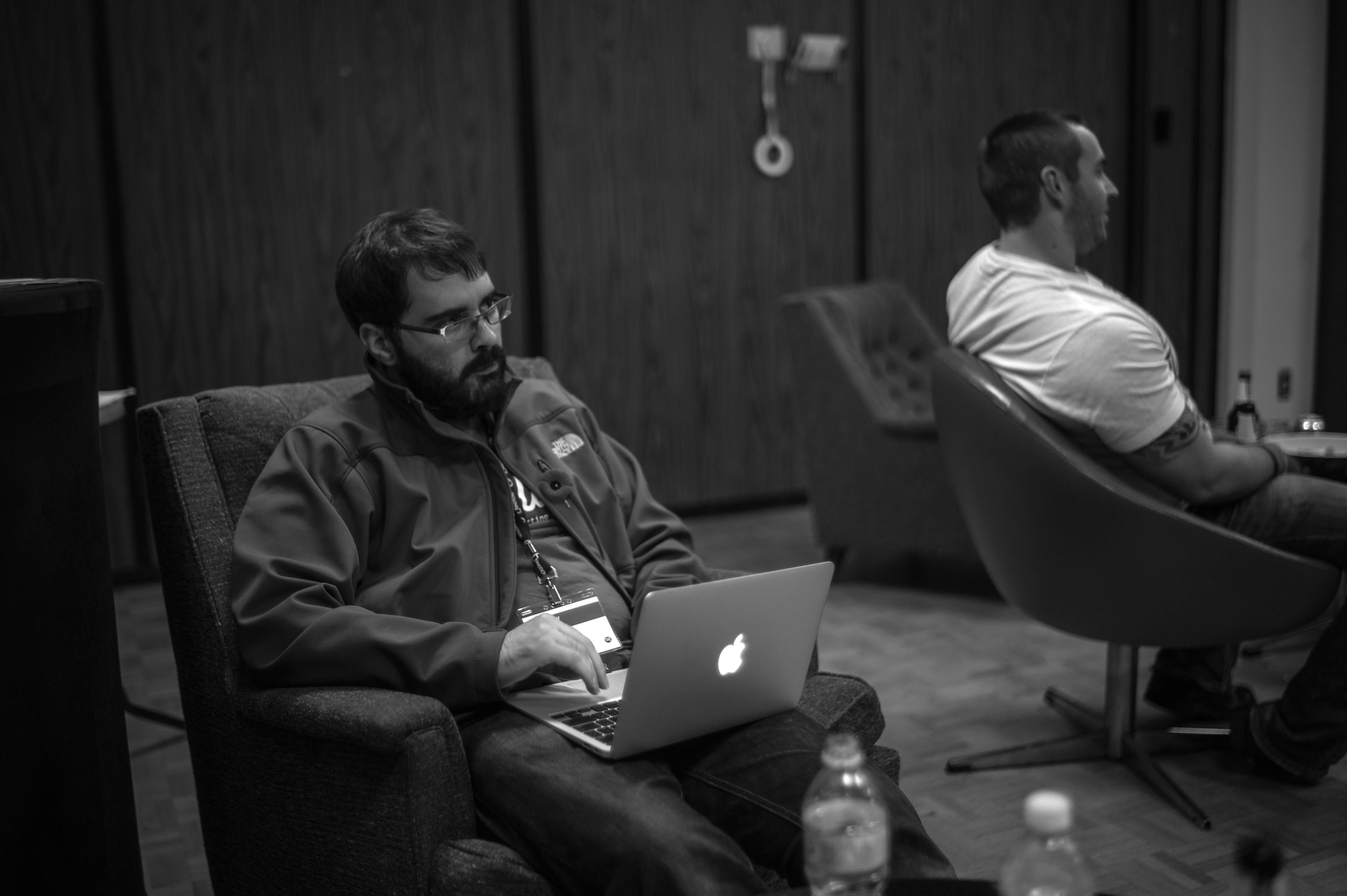 In this black-and-white photograph, a man sits in a comfortable chair, absorbed in his laptop, exuding a sense of concentration and contemplation. The muted lighting casts a gentle ambiance over the scene, highlighting his pensive expression against the backdrop of a casual gathering, where another figure reclines in a modern chair nearby, contrasting the two moods. The composition effectively captures a moment of introspection amid a social setting, inviting viewers to ponder the balance between connectivity and solitude.