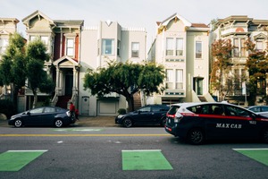 This photograph captures a vibrant urban scene featuring a row of eclectic residential buildings, showcasing a mix of classic and contemporary architecture. The cool morning light casts soft shadows across the street, enhancing the inviting atmosphere while a solitary figure adds a sense of life to the composition. The contrasting green bike lanes introduce a playful element, bridging the traditional with the modern city vibe.