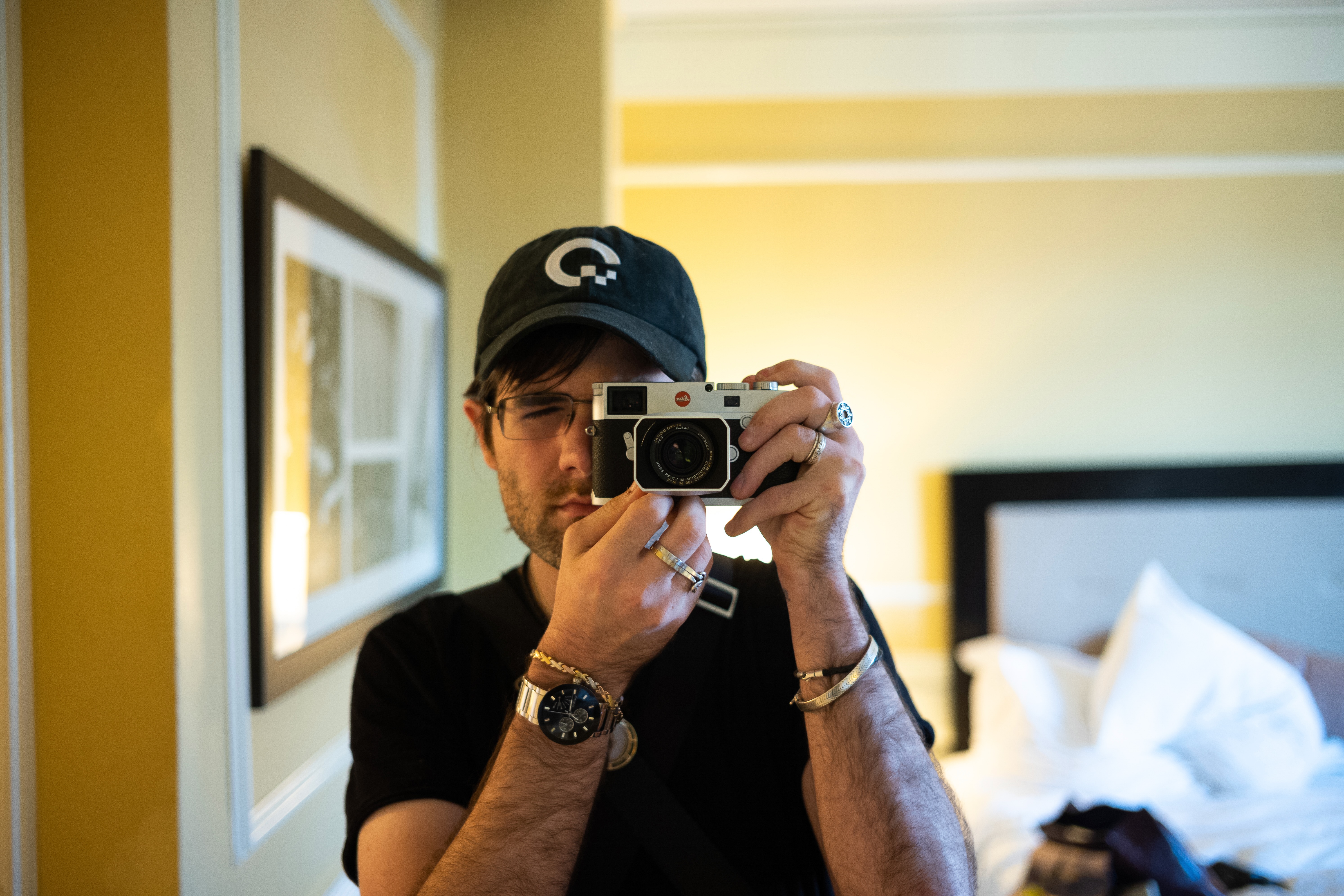 In a softly lit hotel room, a man stands confidently with a vintage camera aimed at the viewer, creating an intimate moment of self-portraiture. The warm yellow tones of the room contrast with his dark attire, suggesting a blend of nostalgia and modernity. His expression is contemplative, evoking a sense of artistry and personal connection amidst a casual setting.