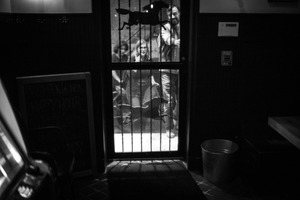 The photograph captures a dimly lit interior framed by a barred door, creating a sense of separation between the inside and outside worlds. Two figures—one grinning and the other peering closely—add a dynamic tension, their expressions illuminated by soft outside light. The contrast of shadows and highlights enhances the mysterious and slightly whimsical mood, inviting viewers to ponder the story unfolding just beyond the threshold.
