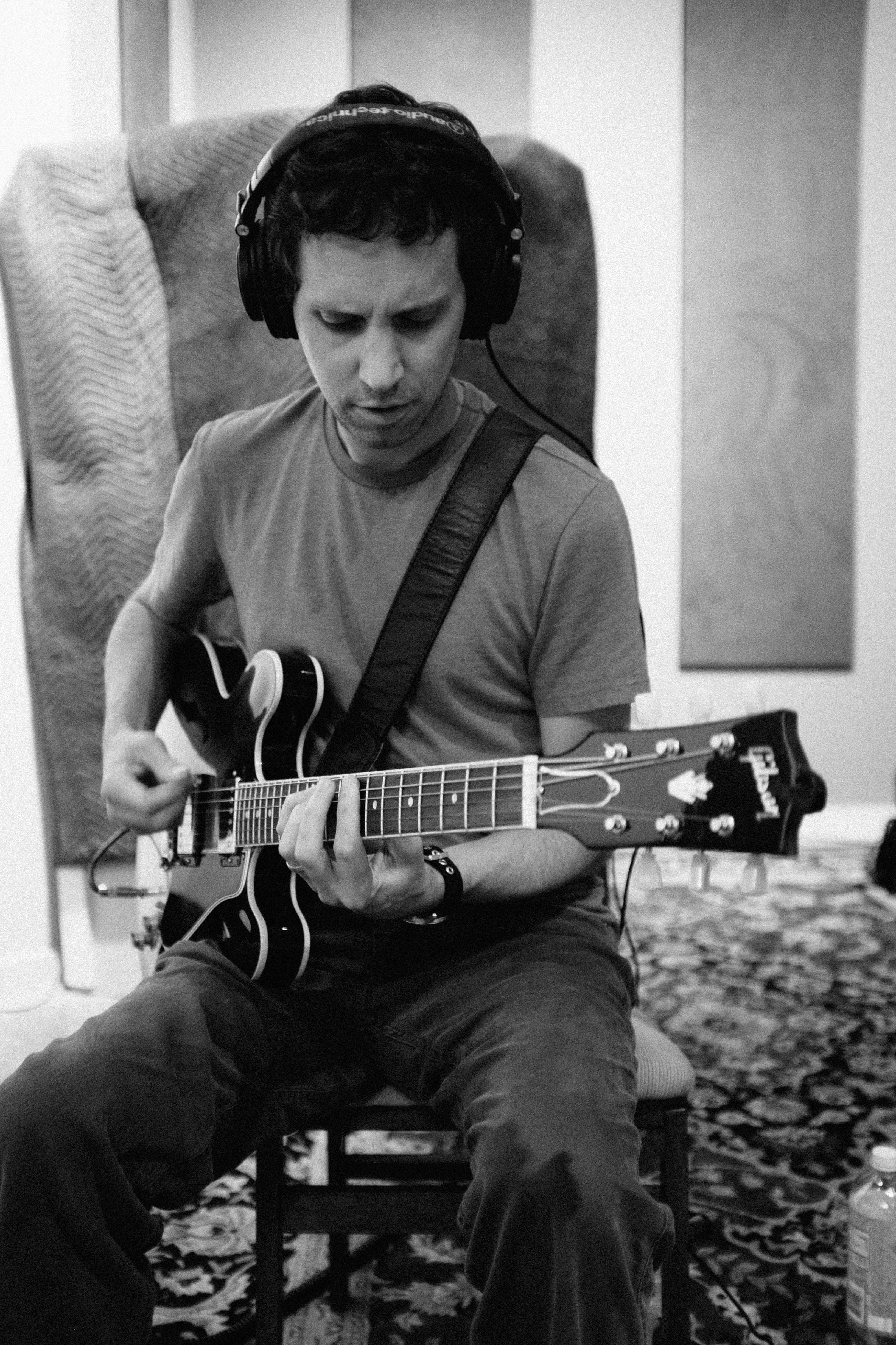 In a candid moment of musical creation, a man focuses intently on his guitar, expressing a deep connection to the instrument. The monochrome tones amplify the intimate mood, while soft lighting casts gentle shadows, emphasizing his concentration. Surrounded by soundproofing elements, the composition captures a serene yet dynamic atmosphere, inviting viewers to feel the music he creates.