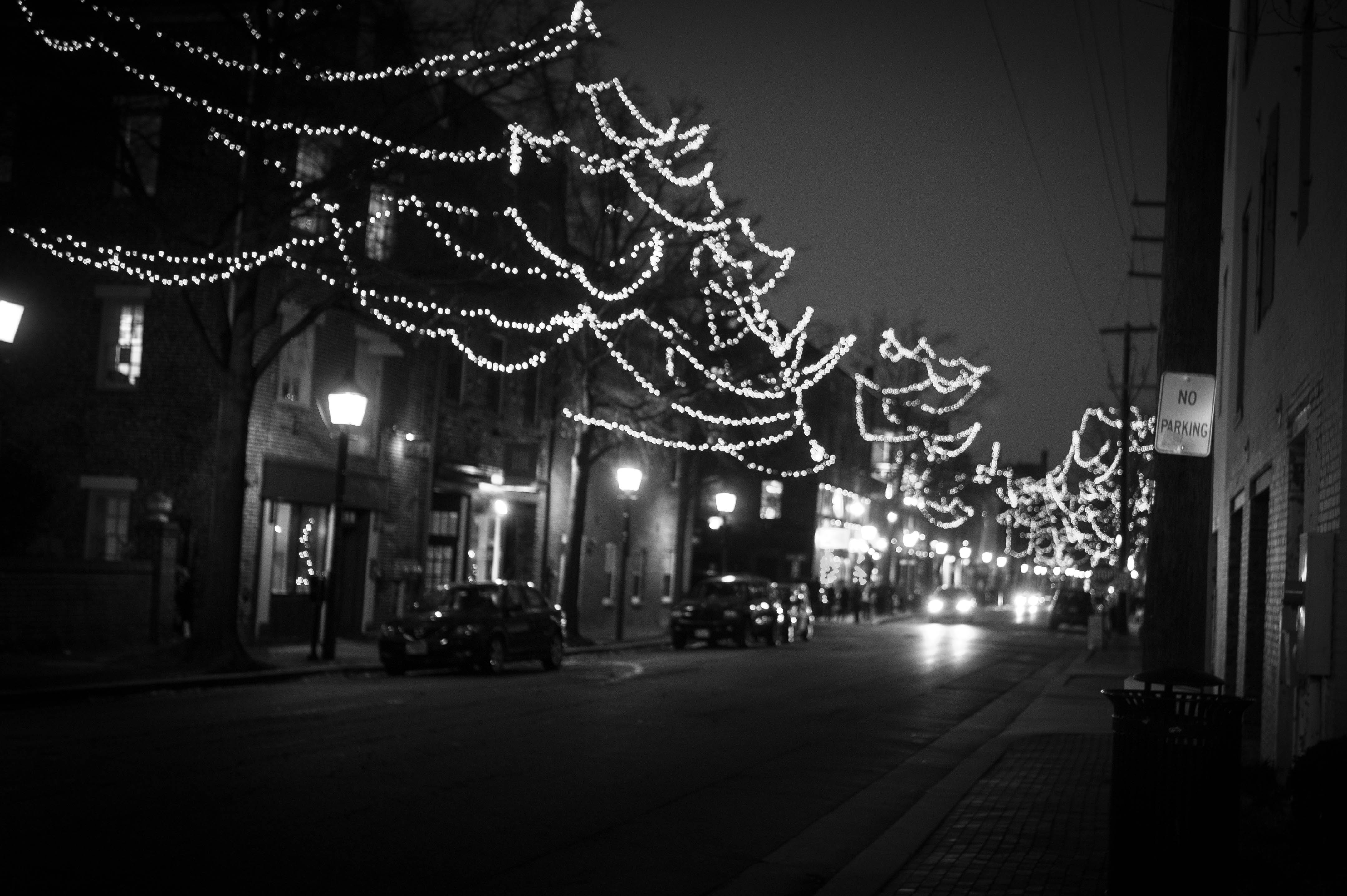 The photograph captures a quiet street illuminated by shimmering holiday lights against a softly blurred backdrop. Lampposts add a warm glow to the scene, enhancing the serene and contemplative mood of the night. This black-and-white composition emphasizes contrast, drawing the eye along the softly lit pavement towards the distant glow of shops.