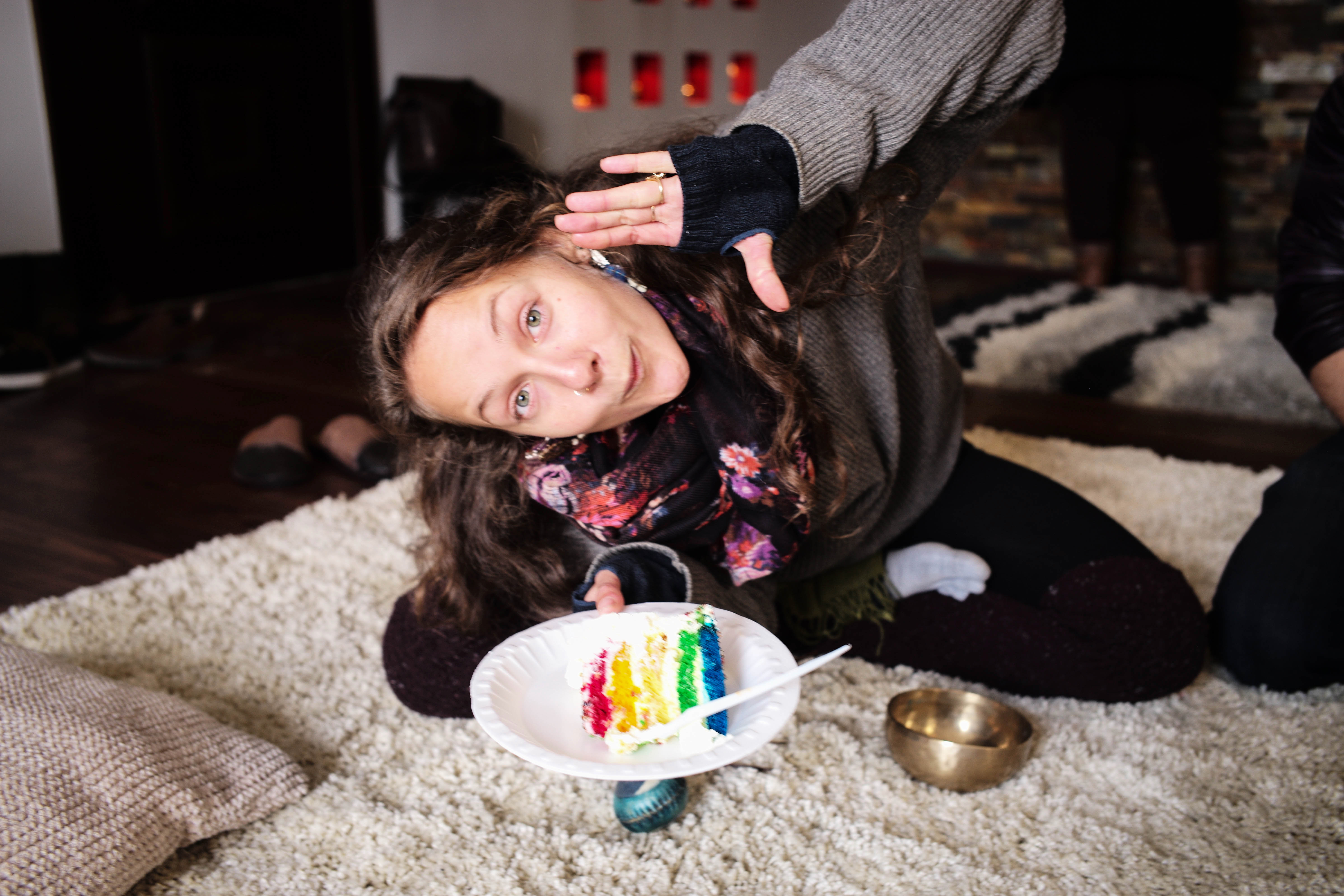 In a cozy, warmly lit setting, a young woman playfully poses with a slice of rainbow cake, showcasing her lively spirit. The soft texture of the rug and subtle background hints at a gathering, while her vibrant scarf adds a touch of color to the scene. Her enthusiastic gesture and joyful expression create an inviting, celebratory mood that's both spontaneous and heartwarming.