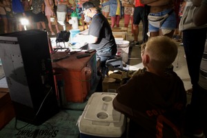 In a dimly lit setting, a crowd watches intently as an artist works on a vibrant creation illuminated only by the focused light above him. The composition draws the eye to a young boy, seated in the foreground, who gazes wide-eyed at the scene, embodying innocence and curiosity. The contrasting shadows and warm colors evoke a lively yet intimate atmosphere, capturing a shared moment of wonder among the spectators.