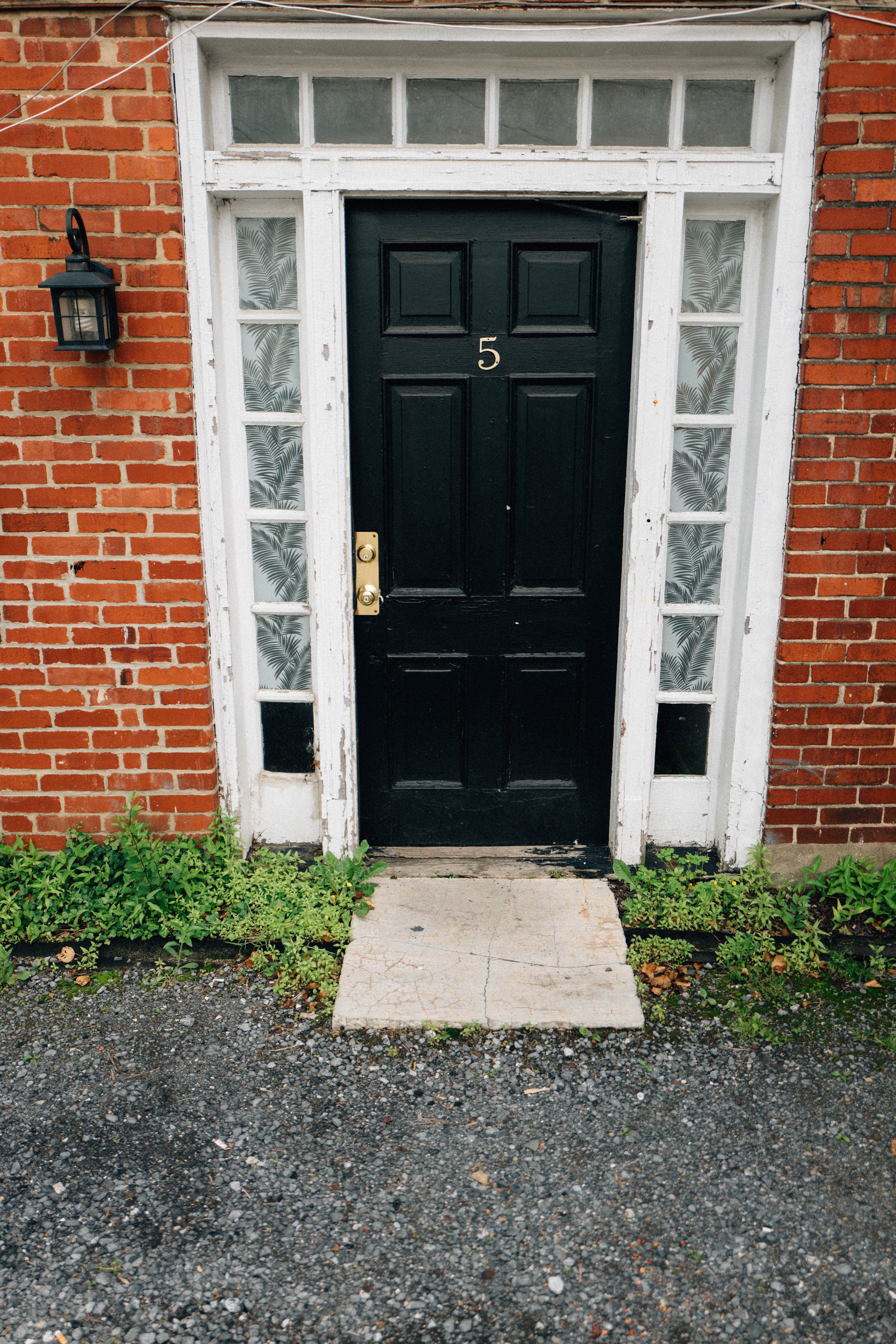 This photograph captures a lone black door marked with the number 5, set against a backdrop of warm red bricks. The soft, diffused lighting creates a welcoming yet mysterious mood, while the surrounding overgrown greenery hints at untold stories just beyond the threshold. The composition draws the eye to the door, inviting curiosity about what lies behind it.