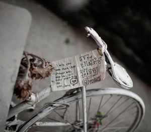 This photograph captures a white, weathered bicycle adorned with a poignant note, evoking a sense of nostalgia and longing. The composition, with muted tones and the soft play of light, emphasizes the forgotten beauty of the bike, while the dried flowers hint at fading memories. Together, they create an intimate atmosphere that reflects deep emotional resonance.