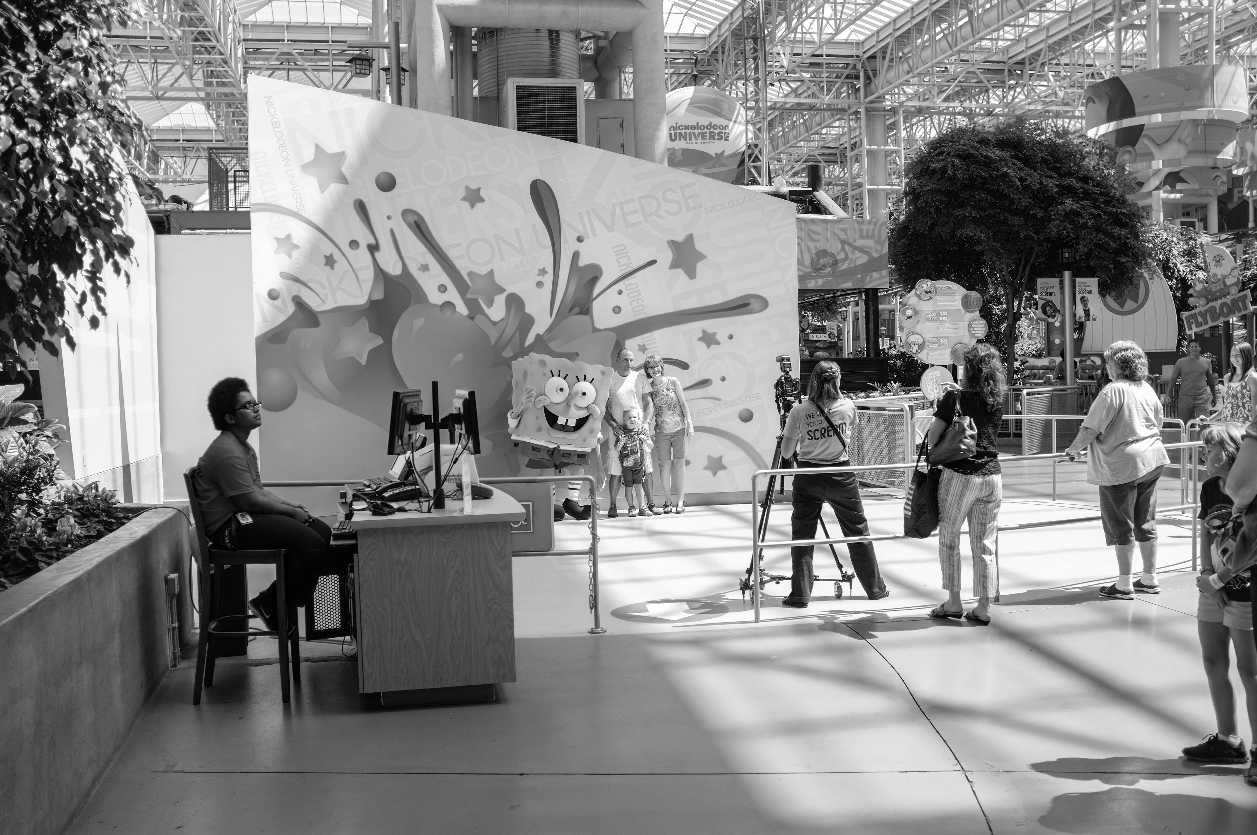 The photograph captures a lively indoor amusement space, where a diverse group of people gather to take pictures with a cheerful cartoon character, SpongeBob SquarePants. The scene is bathed in bright, natural light filtering through the glass ceiling, contrasting against the monochrome tones that lend a nostalgic mood to the moment. The composition draws the eye towards the interaction between the visitors and the character, while a solitary attendant oversees the joyful chaos from his perch at a desk.