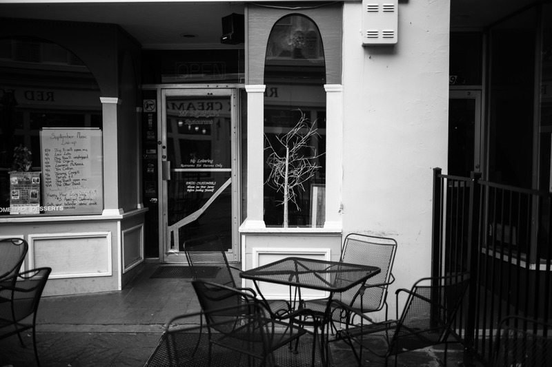 The photograph captures a serene café entrance, framed by elegant arches and adorned with a simple, leafless branch displayed in a window. The black and white composition enhances the mood of nostalgia and quietude, inviting contemplation. Sleek metal tables stand empty in the foreground, hinting at the lively conversations that once filled the space, contrasting with the stillness of the moment.