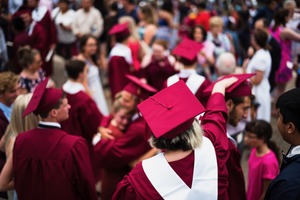 In a vibrant scene, graduates in maroon caps and gowns celebrate amidst a lively crowd. The photograph captures the joyful energy of the moment, as friends and family embrace and cheer, highlighted by focused lighting on the graduates. The composition draws the viewer's eye through a mix of blurred backgrounds and sharp foreground elements, enhancing the sense of community and shared achievement.