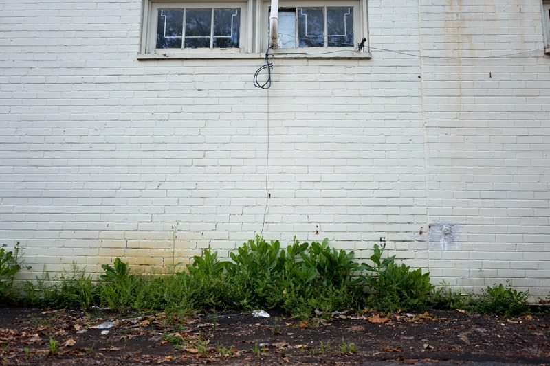 The photograph captures a low-angle view of a weathered white brick wall, punctuated by two small windows above a patch of overgrown greenery. The mood is somber yet tranquil, evoking a sense of neglect and the passage of time, as muted lighting gently highlights the textures of both the wall and surrounding plants. The composition draws the eye downward, creating a disconnect between the abandoned structure and the life attempting to reclaim its space below.