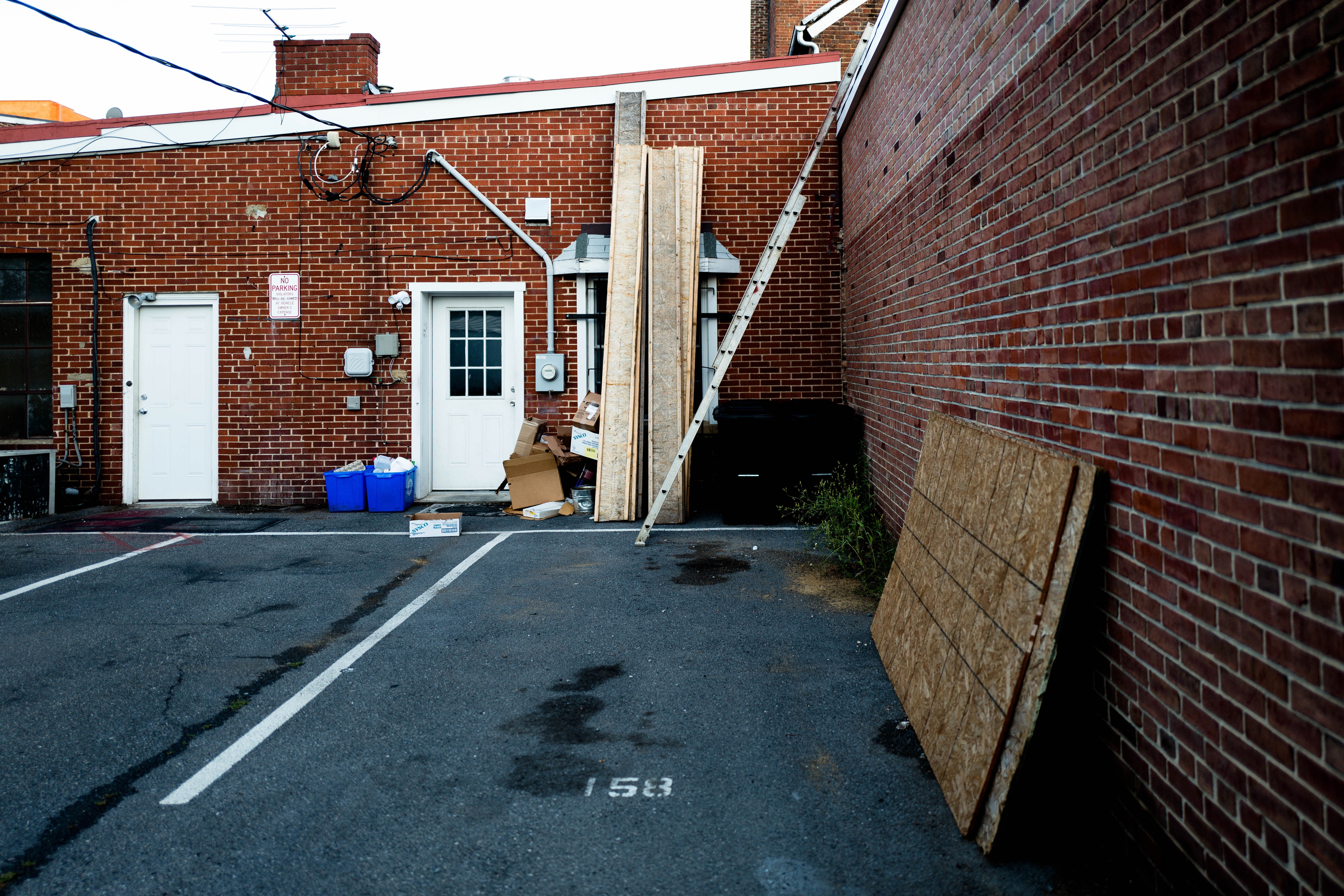 This photograph captures a quiet urban alleyway, framed by rustic brick walls. The sunlight casts a warm glow, highlighting the contrast between the stacked wooden planks and the discarded items. The mood is surprisingly serene, evoking a sense of neglect yet hinting at potential stories hidden within the ordinary details.