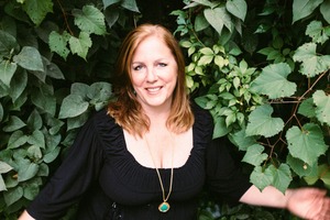 The photograph captures a woman smiling amidst a lush backdrop of green leaves, exuding a warm and inviting mood. Her black attire contrasts softly with the vibrant greenery, while natural lighting accentuates her features and adds a gentle glow. The composition feels organic and harmonious, as if she seamlessly blends with her surroundings, celebrating the beauty of nature and connection.