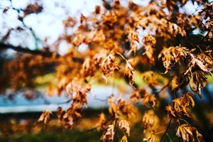 The photograph captures a close-up of withered, orange-brown leaves clinging to a branch, evoking a sense of autumn's quiet decline. Soft, diffused light gently illuminates the leaves, adding warmth to the muted tones and enhancing the melancholic yet serene mood. The background fades into an indistinct blur, emphasizing the fragility of the leaves and inviting contemplation of nature's cycles.