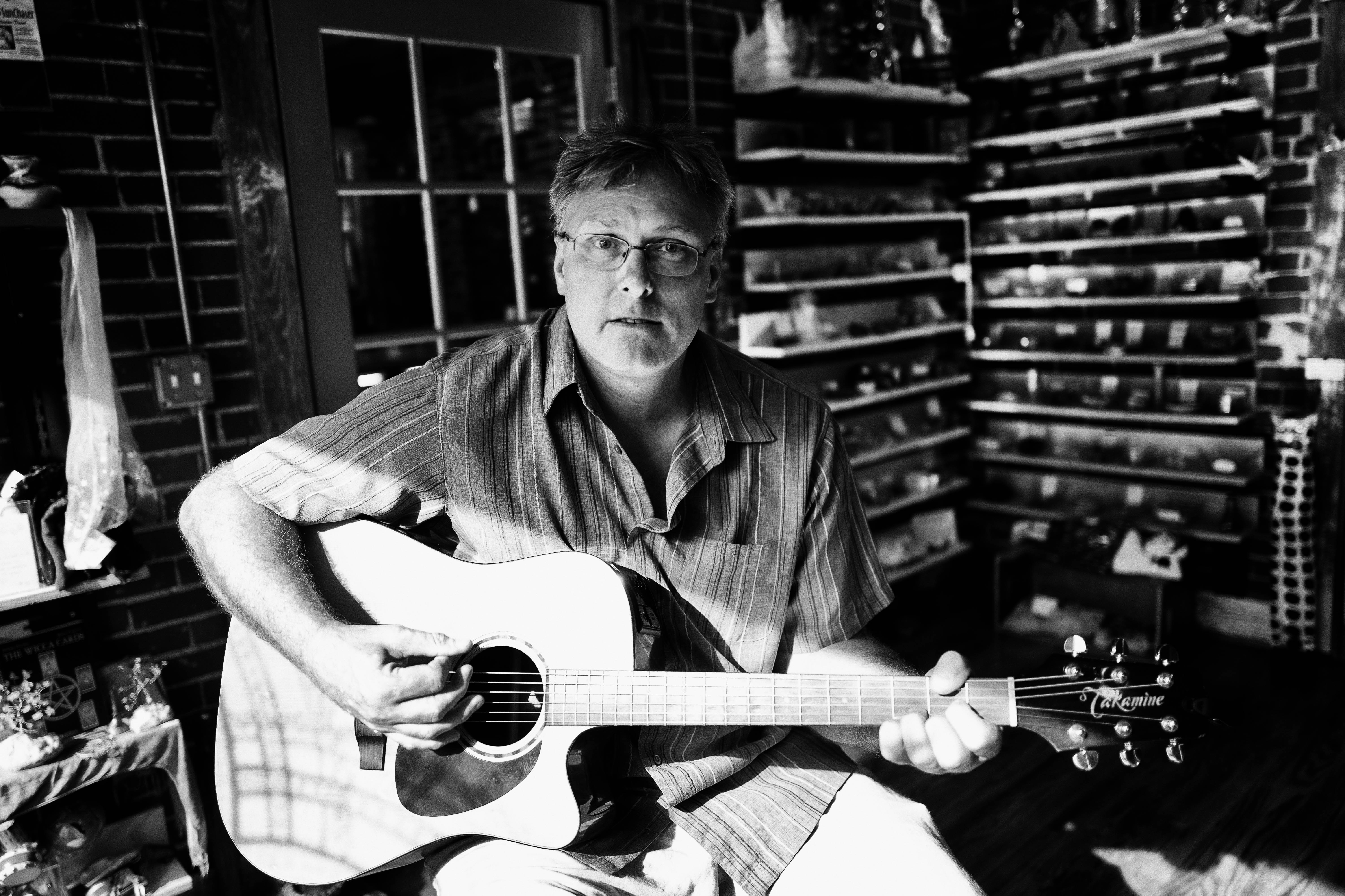 The photograph captures a man seated with an acoustic guitar, exuding a contemplative mood. Bathed in soft, natural light filtering through a nearby window, the contrast of shadows and highlights enhances the intimacy of the scene. The cluttered background adds a sense of depth and narrative, suggesting a space filled with stories and memories.