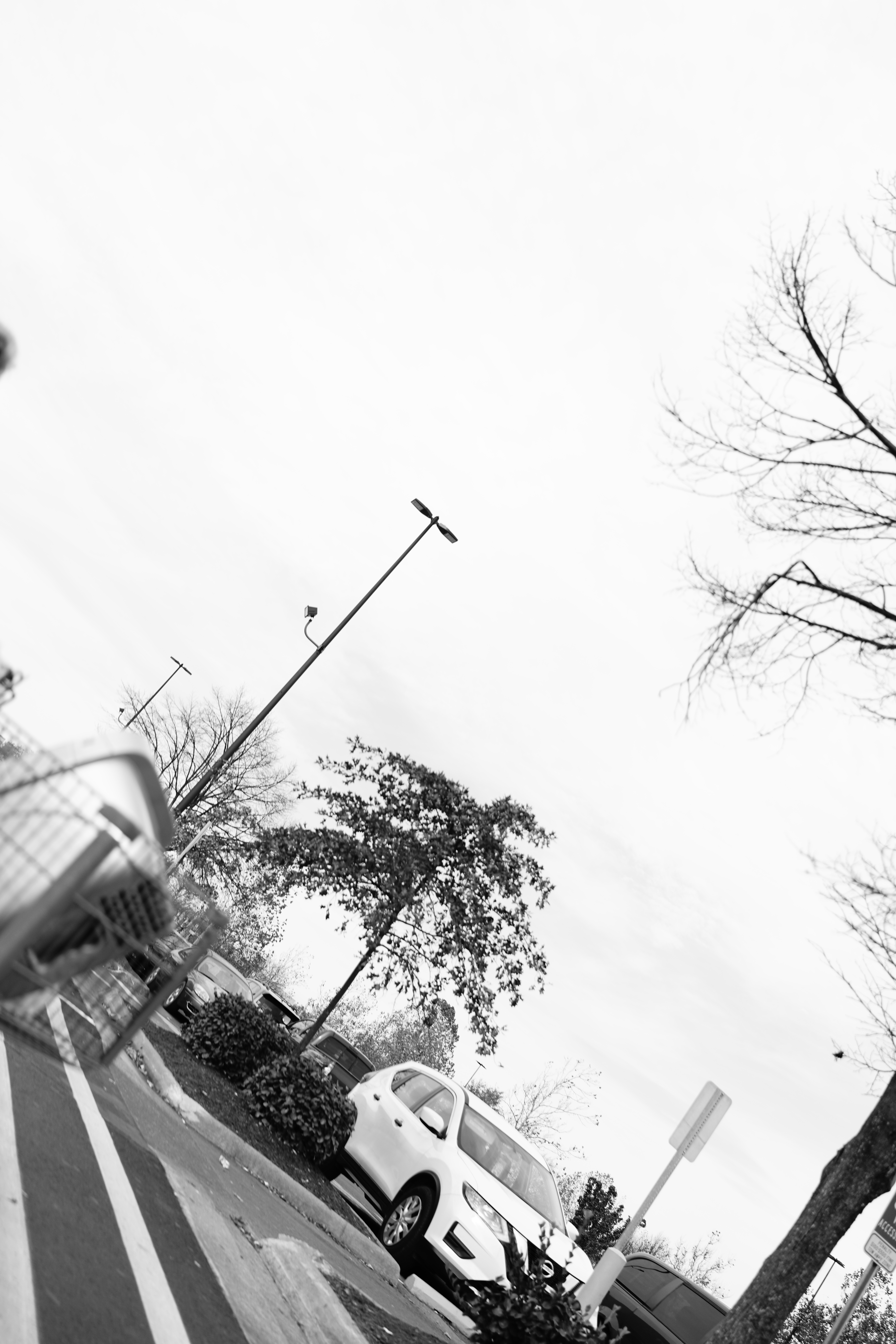 A monochromatic photograph captures a quiet parking lot, where a white car sits subtly amidst sparse trees and distant lampposts. The tilted perspective creates a sense of unease, while the soft, diffused light evokes a calm yet slightly melancholic mood. The absence of vibrant colors enhances the starkness of the scene, inviting contemplation of the everyday urban landscape.