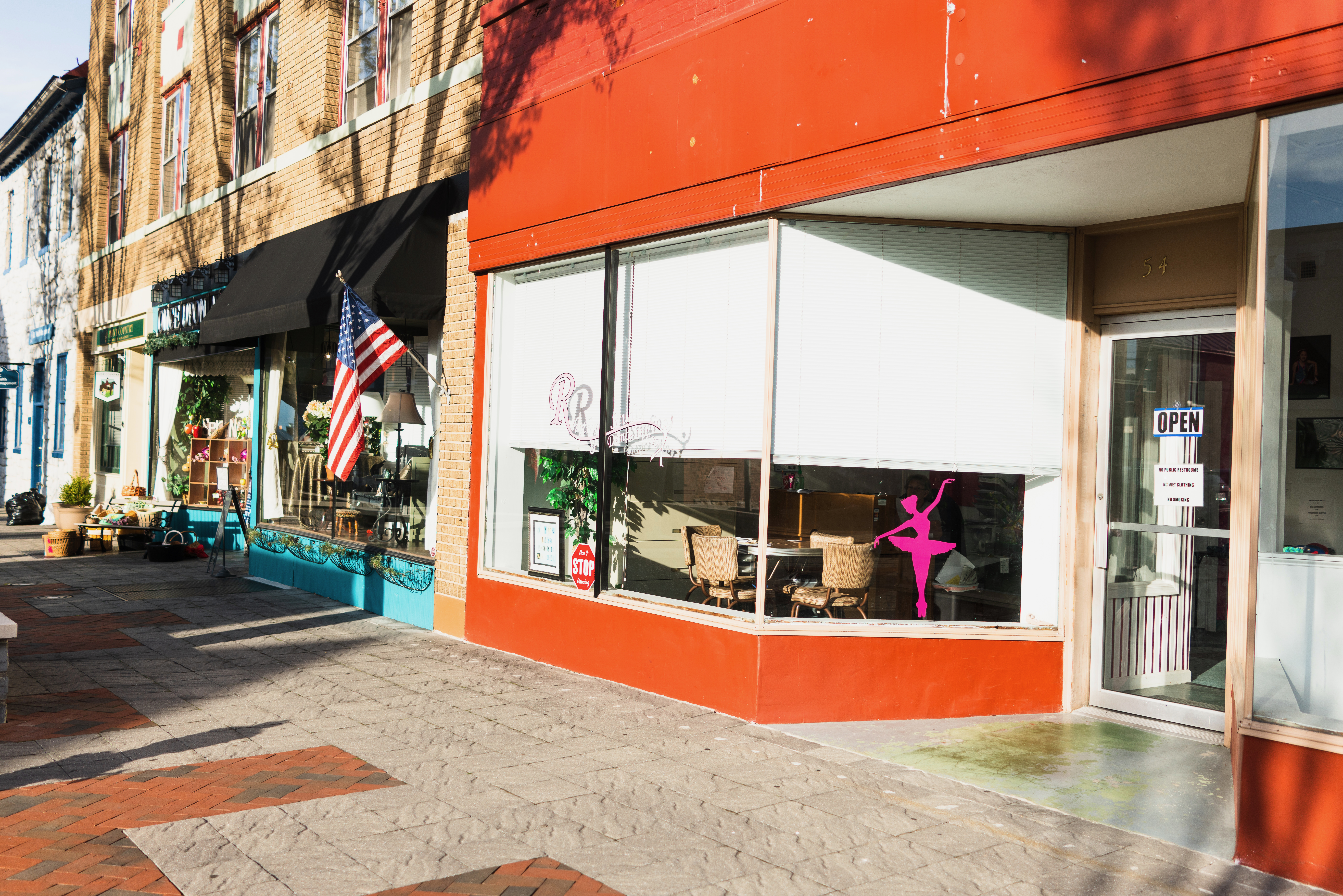 This photograph captures a vibrant street scene where a red storefront contrasts with the muted tones of neighboring shops. The play of sunlight casts dynamic shadows, adding depth to the composition, while the cheerful pink ballet dancer silhouette in the window hints at artistic pursuits within. The overall mood is inviting and lively, suggestive of a community full of character and creativity.