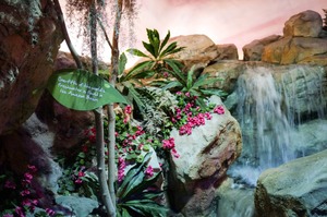 This photograph captures a serene waterfall nestled among vibrant foliage and rocky terrain, evoking a sense of tranquility. The warm lighting highlights the rich greens of the plants and the soft pinks of the flowers, creating a lush oasis. A small informative sign adds an educational touch to this natural retreat, inviting contemplation of the Amazon's vital ecosystem.