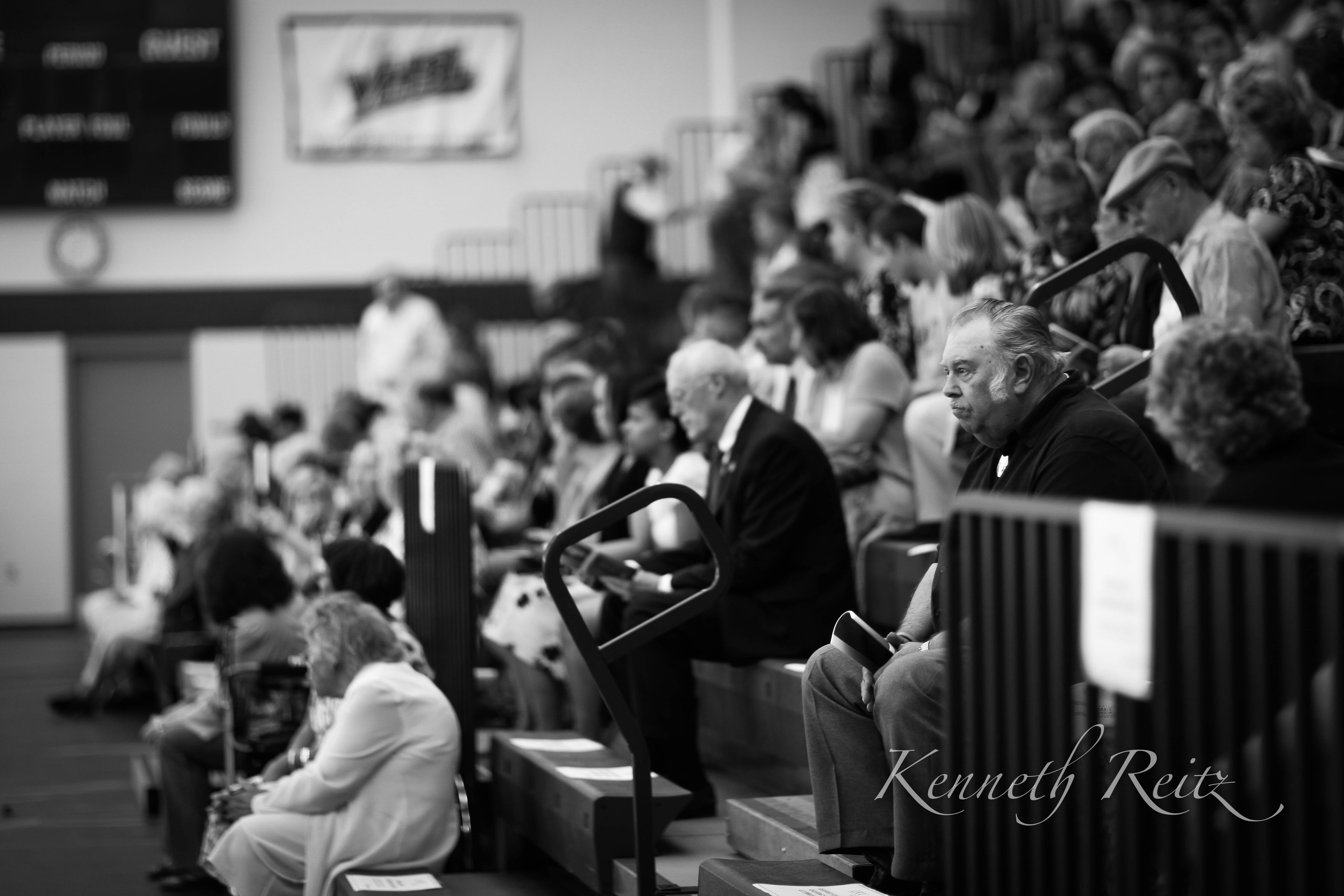 A monochrome photograph captures a gathering of seated attendees in a gymnasium, each lost in their thoughts amidst a sea of faces. The soft lighting creates a contemplative mood, while the varied expressions hint at a shared yet private emotional experience. The composition emphasizes the isolation of individuals within a collective setting, drawing attention to their silent connections.