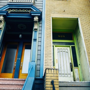 This photograph captures two adjacent doorways, each showcasing distinct architectural styles and colors. The left door, framed in rich blues and adorned with ornate details, exudes elegance, while the right door, painted in a vibrant green and slightly weathered, contrasts with a sense of understated simplicity. The lighting subtly highlights the textures and colors, enhancing the mood of juxtaposition between the two entrances.