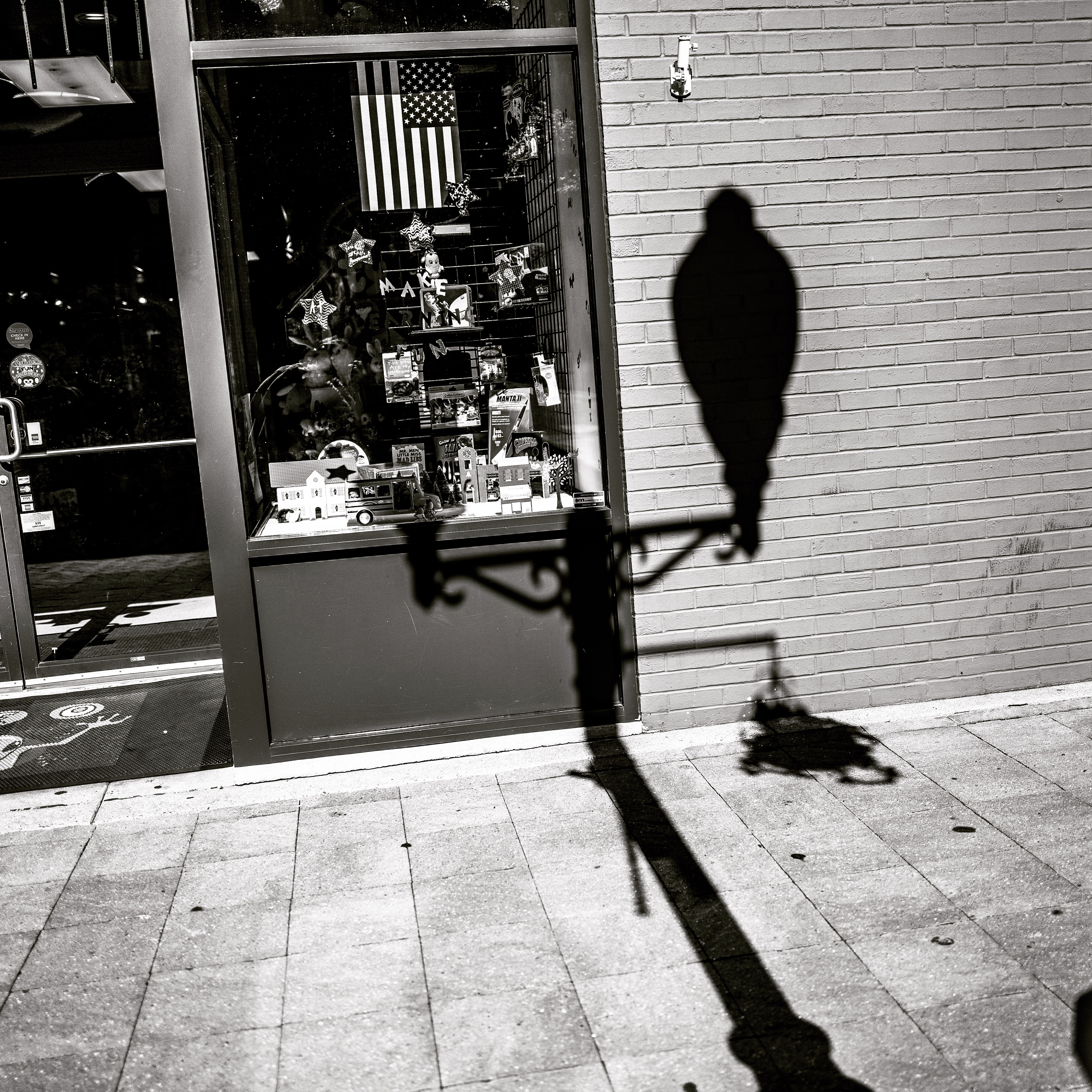 This intriguing photograph captures the interplay between light and shadow, showcasing a stark silhouette of a streetlamp that resembles a bird perched above a quaint shop window decorated with toys. The black-and-white composition enhances the contrast, evoking a sense of nostalgia and quiet contemplation. The American flag subtly hints at the location, while the soft afternoon light casts gentle textures on the brick wall.