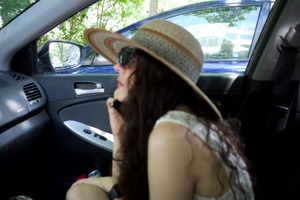 In a sunlit car interior, a young woman with long, wavy hair and a wide-brimmed straw hat is engaged in a phone conversation. The soft, dappled light filtering through the trees outside creates a tranquil and contemplative mood, while the blurred background adds a sense of intimacy and isolation.
