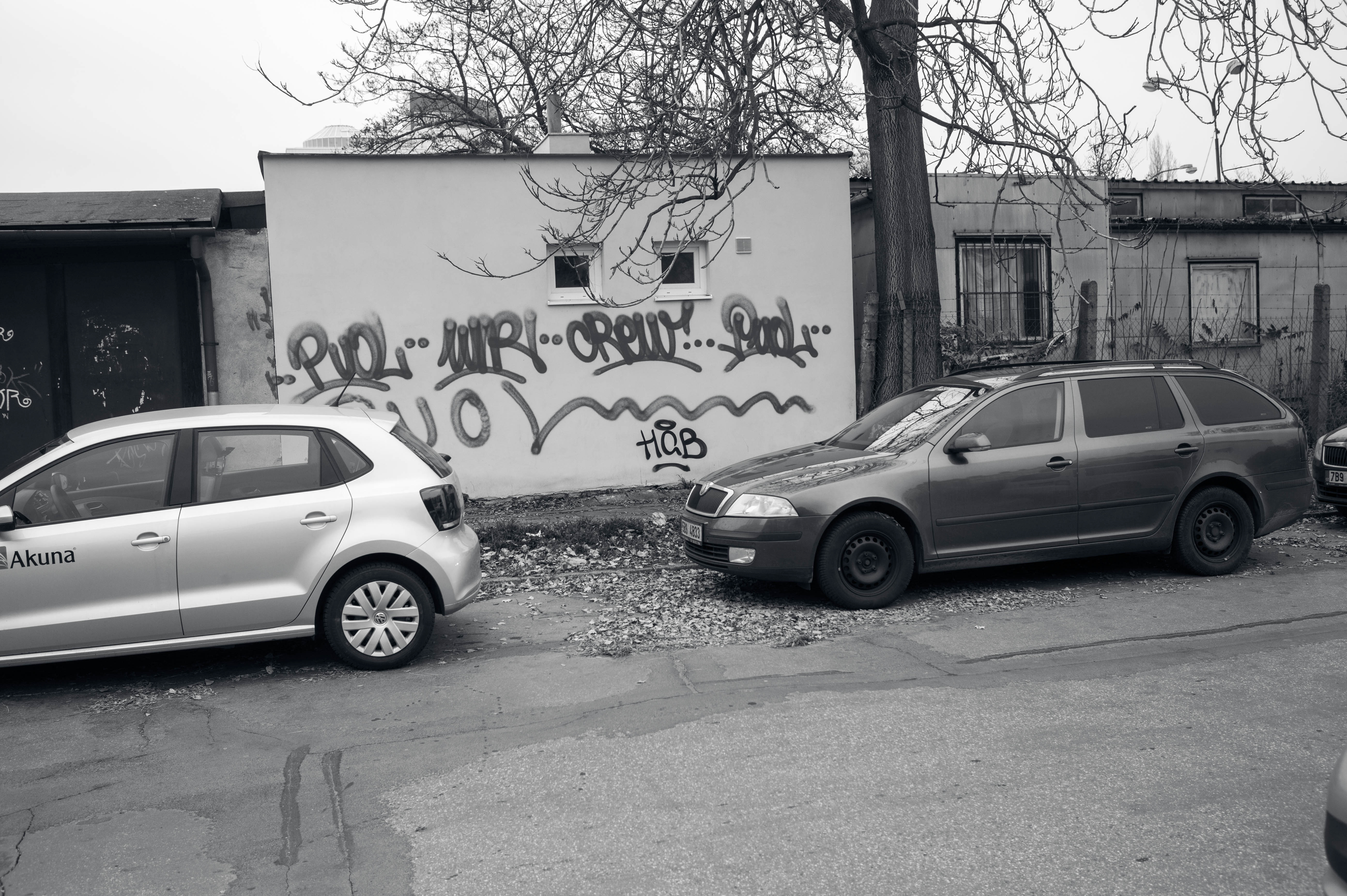 A pair of parked cars flank a graffiti-covered wall, capturing the gritty vibe of an urban environment. The monochromatic palette enhances the mood of desolation and neglect, as leafless branches stretch overhead, hinting at an early spring chill. The composition invites a contemplative gaze, drawing attention to the stark contrast between the vehicles and the vibrant, yet weathered street art behind them.