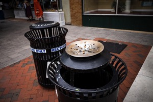 The photograph captures two contrasting trash receptacles in an urban setting, showcasing the themes of waste management and civic responsibility. The muted lighting creates a contemplative mood, highlighting the importance of recycling amidst everyday life. The composition balances the round shapes of the bins with the sharp lines of the surrounding pavement, drawing the eye to both forms and their function in the cityscape.