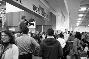 A bustling conference scene comes alive in monochrome, where crowds mingle, exuding a sense of excitement and collaboration. The elevated cameraman captures the energy from above, drawing attention amidst the sea of attendees engaged in conversation. Soft lighting highlights the varied expressions of the crowd, suggesting a moment of shared inspiration and discovery.