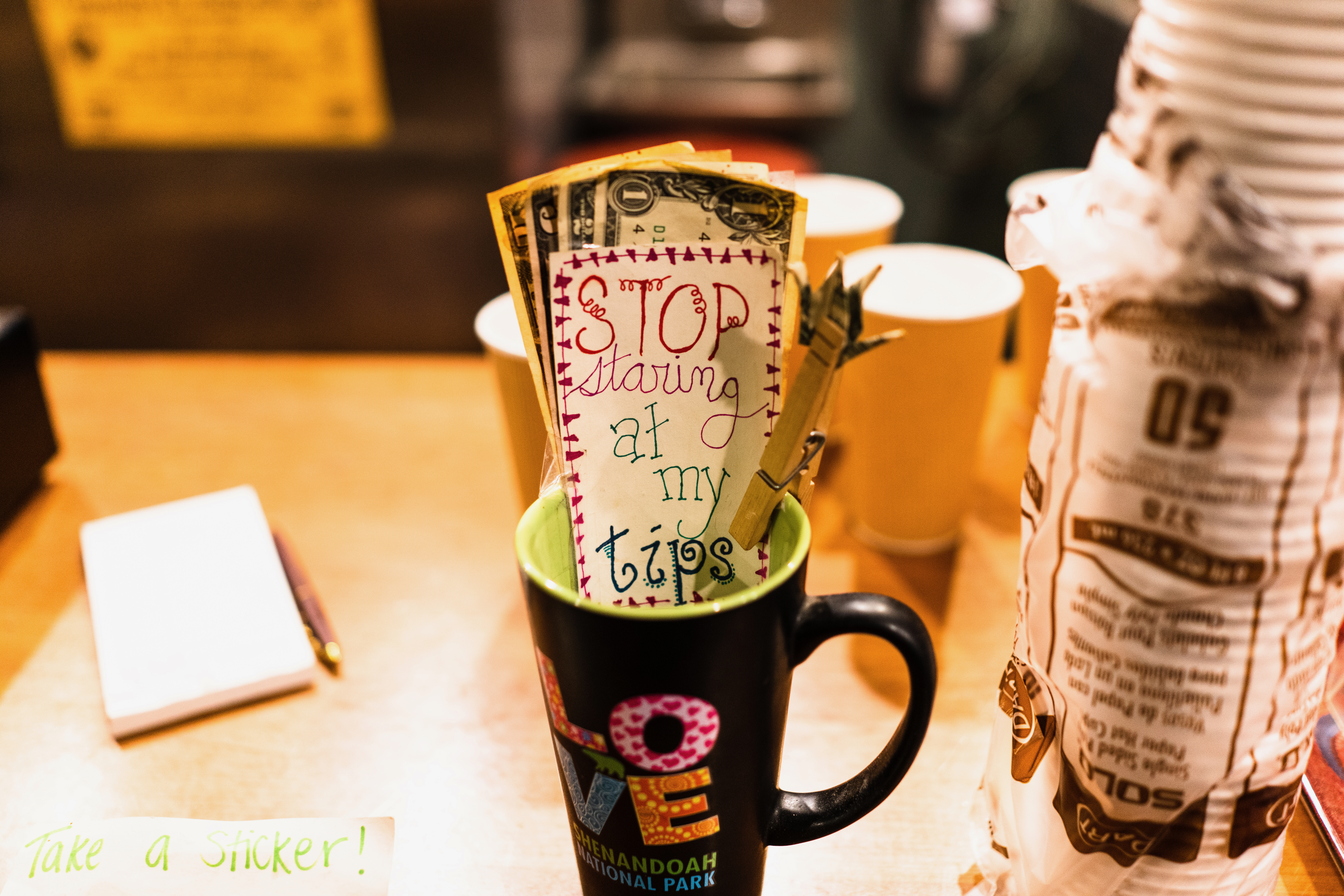 This playful photograph captures a creatively decorated mug filled with cash and a humorous sign that reads, "STOP staring at my tips." The warm lighting adds a cozy ambiance, drawing attention to the cheerful composition of the vibrant mug against the blurred background of a cafe. The overall mood is lighthearted and inviting, reflecting a fun, personal touch in a bustling environment.