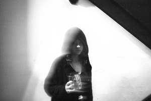 The photograph captures a figure partially obscured by a hood, suggesting an air of anonymity and intrigue. Soft, contrasting lighting enhances the ethereal quality, as the motion blur lends a sense of movement and fleeting presence. The stark white wall juxtaposes the dark attire, creating a haunting yet contemplative mood.