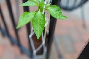 This photograph captures a vibrant green plant, prominently displayed against the backdrop of a black railing. The shallow depth of field emphasizes the lush, textured leaves while the soft, natural lighting creates a serene and refreshing mood, suggesting growth in an urban environment.