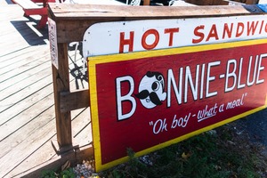This photograph captures a charming, vintage sign for 'Bonnie-Blue,' nestled against rustic wooden railings. The bold red and yellow colors, enhanced by sunlight, evoke a cheerful and nostalgic mood, inviting passersby to savor some hearty sandwiches. The playful graphic of a smiling character adds an element of whimsy, embodying the warmth of a friendly diner atmosphere.