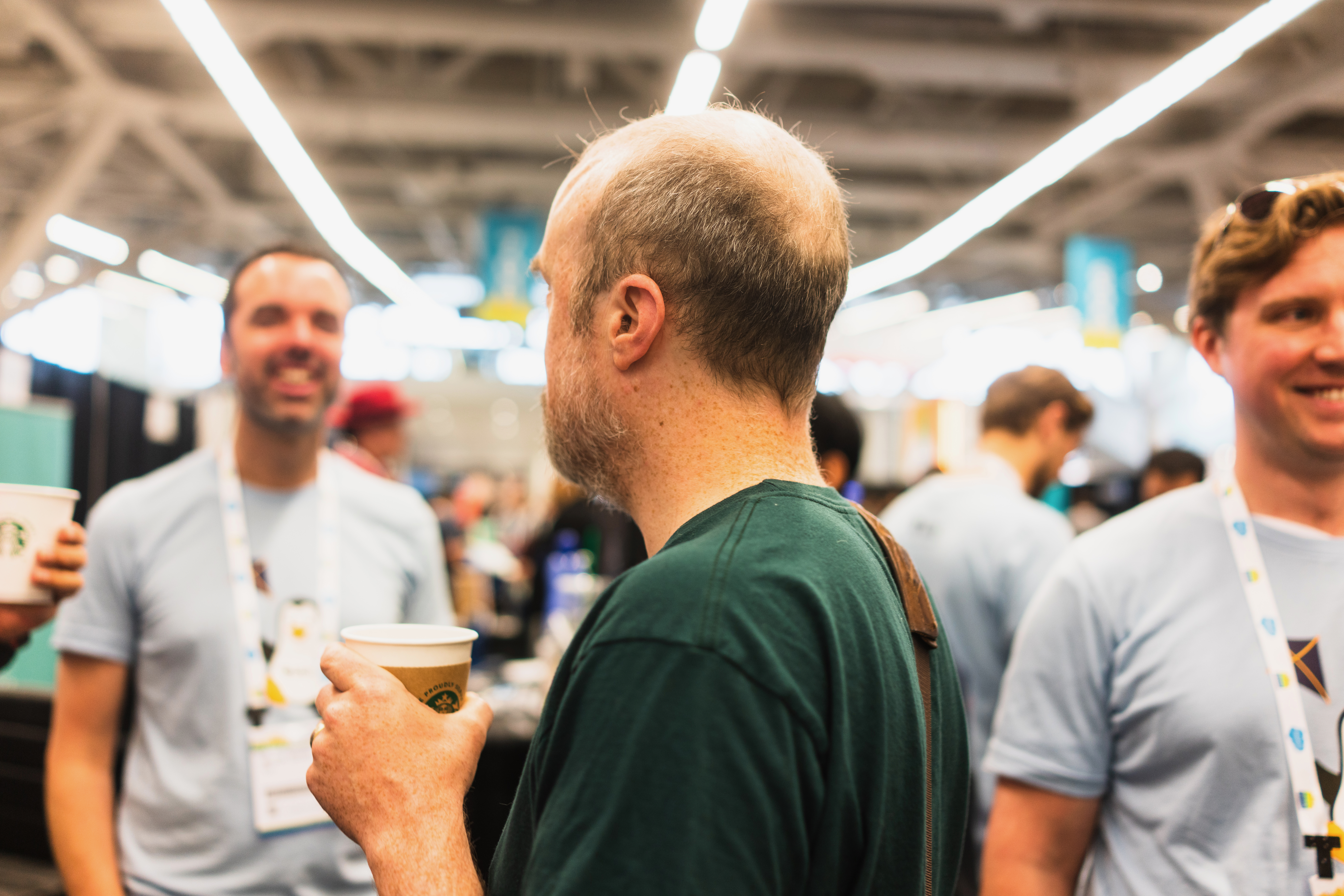 In a bustling event atmosphere, a group of engaged individuals share lighthearted conversation, each holding a cup. The man in green, turned away from the camera, highlights the social dynamics of the gathering, while soft lighting enhances the warm, inviting mood. The blurred background amplifies the focus on the interactions, creating a lively yet intimate feel.