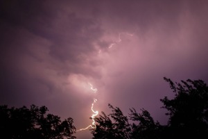 A striking bolt of lightning pierces through the dark, purple-hued clouds, creating a dramatic focal point against the twilight sky. Silhouettes of trees frame the bottom of the image, grounding the tumultuous mood above. The combination of swirling clouds and the electric flash evokes a sense of awe and foreboding, capturing nature's raw power in a moment of stillness.