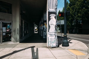 This photograph captures a vibrant urban scene, with striking murals adorning a building column that contrast against the muted tones of the surrounding architecture. Sunlight filters through, casting playful shadows on the pavement and enhancing the lively mood of the setting. The composition invites the viewer to explore the interplay between art and everyday life in the bustling city environment.