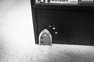 This photograph features a whimsical, miniature door nestled at the base of a shelf, highlighted by the surrounding floor's texture. The monochrome aesthetic enhances the magical yet understated mood, inviting curiosity about the tiny world it hints at. Sparkling stars beside the door add a playful touch, infusing the scene with a sense of wonder.