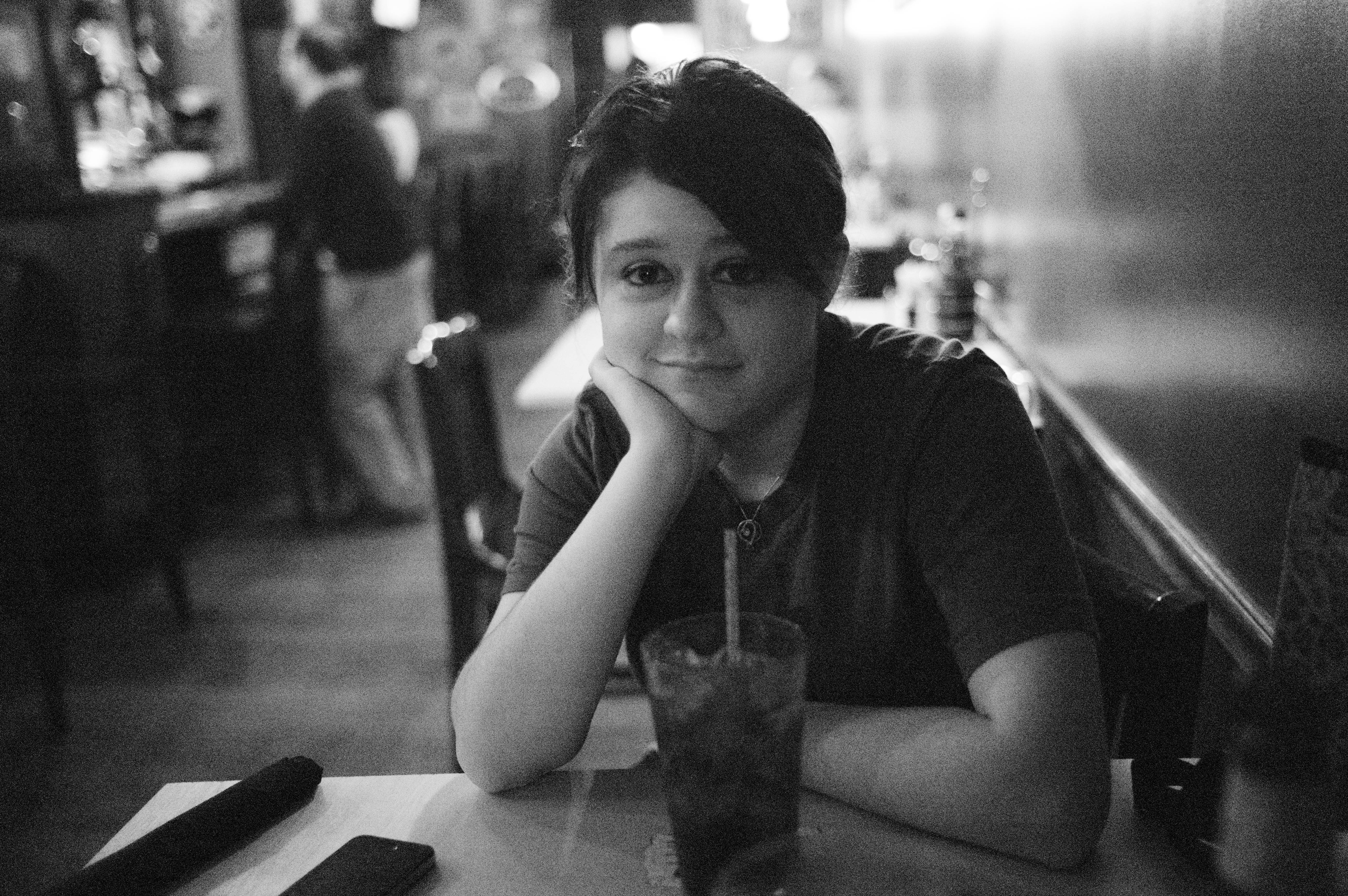 The photograph captures a young person at a café, gazing softly towards the camera with a thoughtful expression. The dim lighting and monochrome tones create an intimate, nostalgic mood, while the blurred background suggests a lively yet distant social atmosphere. The subject's relaxed posture and the glass of drink in front of them evoke a sense of calm amidst the surrounding bustle.