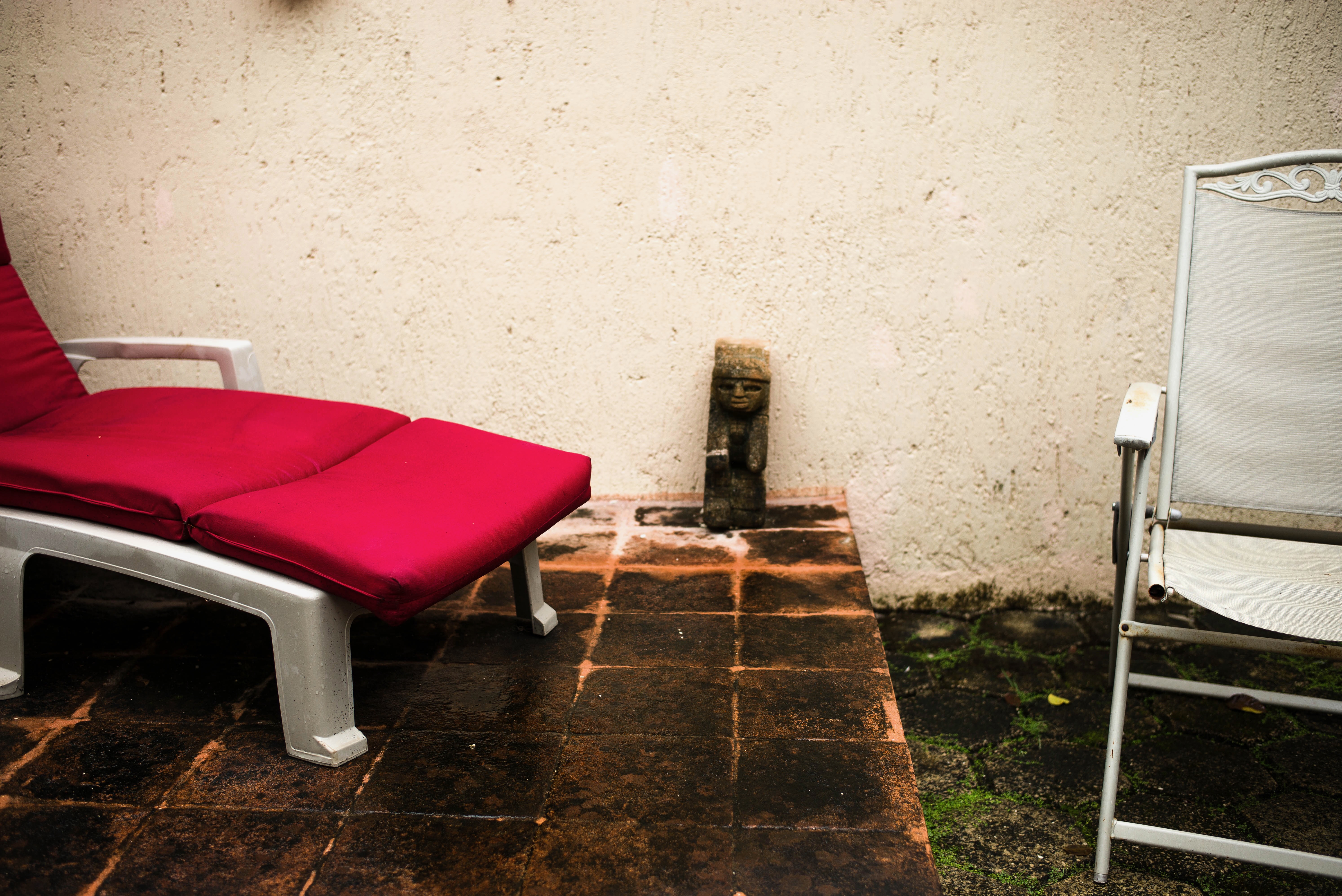 In a serene outdoor setting, a vibrant red lounge chair stands prominently against the muted tones of a textured wall. The soft, diffused lighting enhances the tranquil mood, while a small stone sculpture adds an intriguing focal point, inviting contemplation amidst the simplicity of the scene. The composition balances both comfort and stillness, suggesting a space perfect for quiet moments.