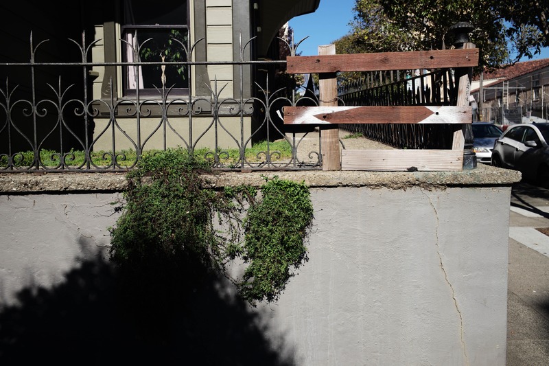 This photograph captures a moment of nature encroaching on man-made structures, with vibrant green plants spilling over a concrete wall. The interplay of sunlight and shadows adds depth to the scene, highlighting the contrast between the soft organic growth and the rigid, angular lines of the fence. The mood is both serene and contemplative, inviting thoughts about resilience and coexistence in an urban environment.