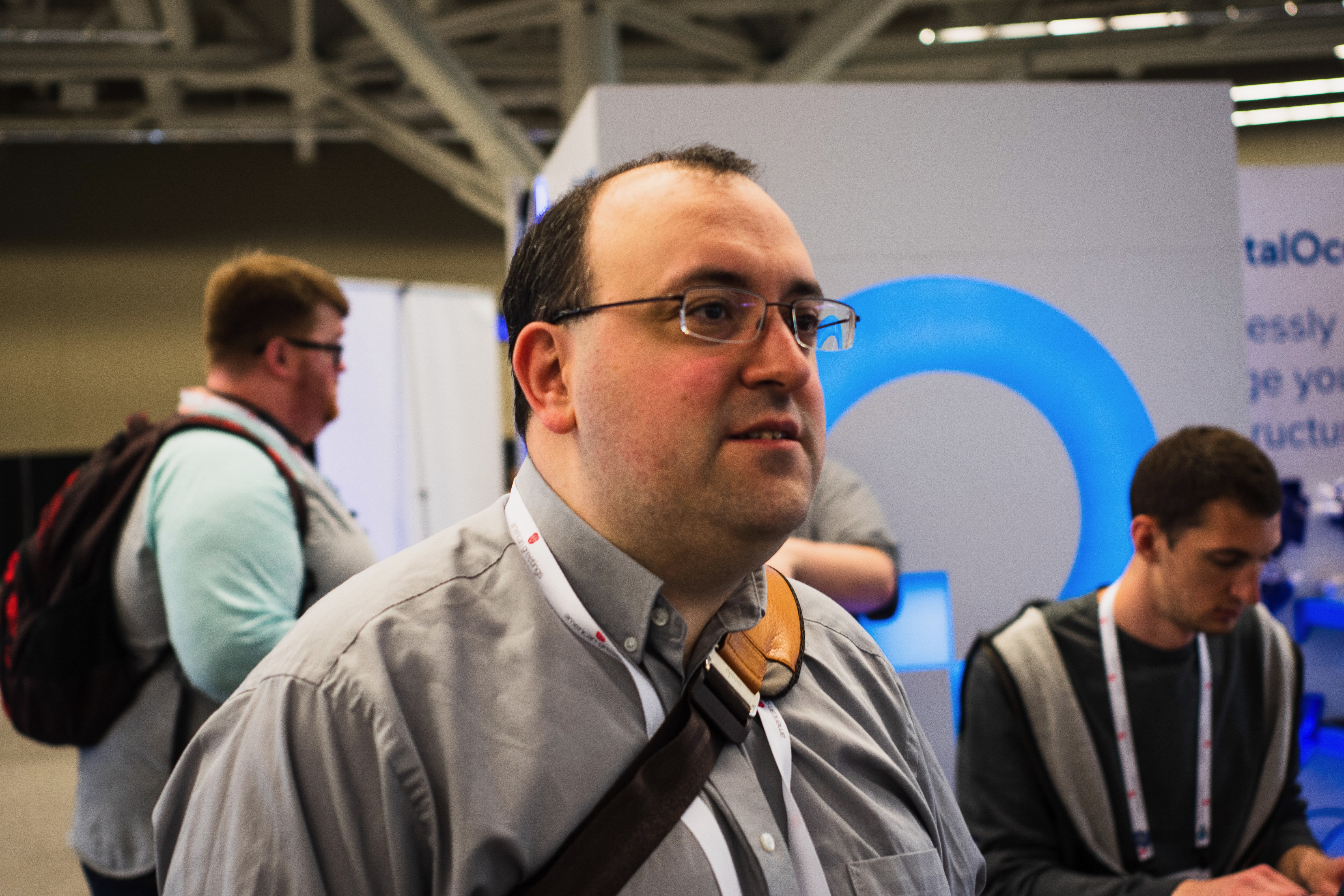 The photograph captures a thoughtful man standing amidst a bustling conference environment, conveying a sense of concentration and engagement. Soft lighting highlights his features, while blurred figures in the background suggest a lively atmosphere. The subtle contrast between his serious expression and the surrounding activity creates an intriguing dynamic.