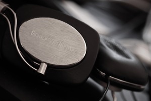This close-up photograph captures the sleek design of high-end headphones, featuring a brushed metal surface that reflects soft light. The composition emphasizes the smooth contours and luxurious materials, creating a mood of sophistication and intimacy with audio. The subdued lighting enhances the textures, inviting viewers to appreciate the craftsmanship behind the device.